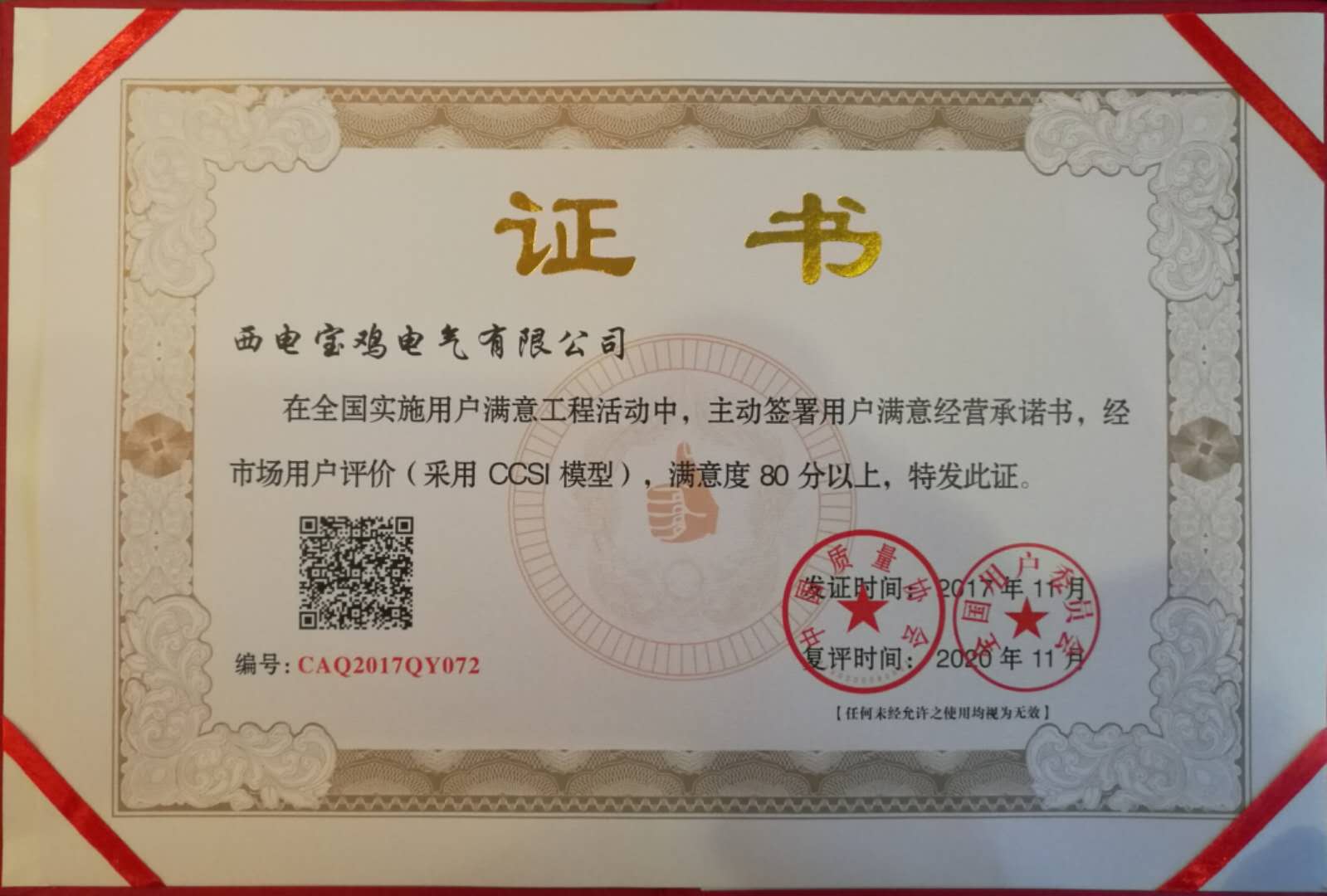 西電寶雞電氣有限公司獲中國(guó)質(zhì)量協(xié)會(huì)全國(guó)用戶滿意企業(yè)證書