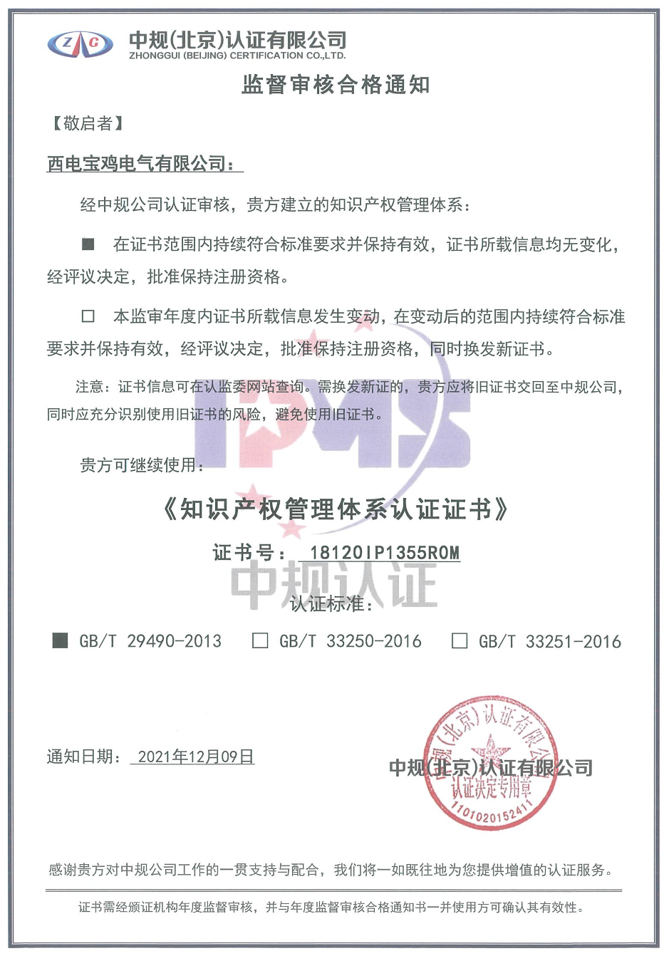 日前,西電寶雞電氣收到中規(guī)(北京)認(rèn)證有限公司發(fā)來的知識產(chǎn)權(quán)管理體系《監(jiān)督審核合格通知書》,經(jīng)認(rèn)證審核組為期二天的嚴(yán)謹(jǐn)、合理、公正的審核,審核組對企業(yè)知識產(chǎn)權(quán)管理工作給予了高度評價,一致同意西電寶雞電氣知識產(chǎn)權(quán)管理體系通過年度監(jiān)督審核,標(biāo)志著企業(yè)知識產(chǎn)權(quán)管理水平邁入新階段。