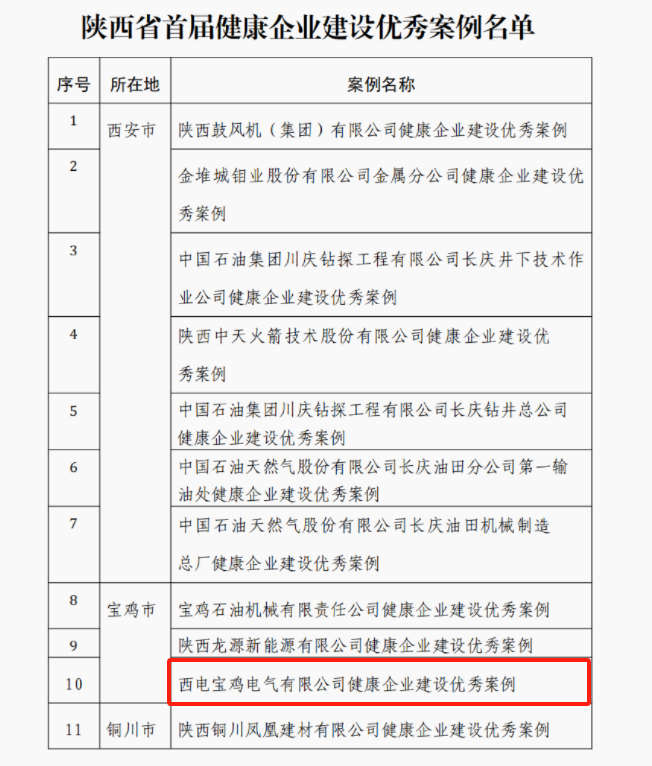 近日,Good news在陜西省衛(wèi)健委組織開展的健康企業(yè)建設(shè)優(yōu)秀案例征集活動(dòng)中,西電寶雞電氣脫穎而出,成功入選陜西省首屆健康企業(yè)建設(shè)優(yōu)秀案例名單。這一榮譽(yù)不僅是對企業(yè)以人為本、關(guān)愛員工健康理念的高度認(rèn)可,更為省內(nèi)企業(yè)健康建設(shè)樹立了示范標(biāo)桿。